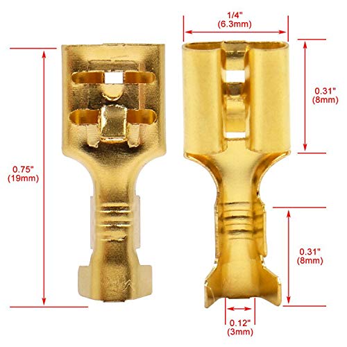 Ancho del conector: 6,3 mm Adecuado para cables de 1 mm² a 1,5 mm² Material: latón Nuestra tienda de Amazon (Baomain) tiene una oferta de otros terminales Contenido del paquete: 100 terminales hembra